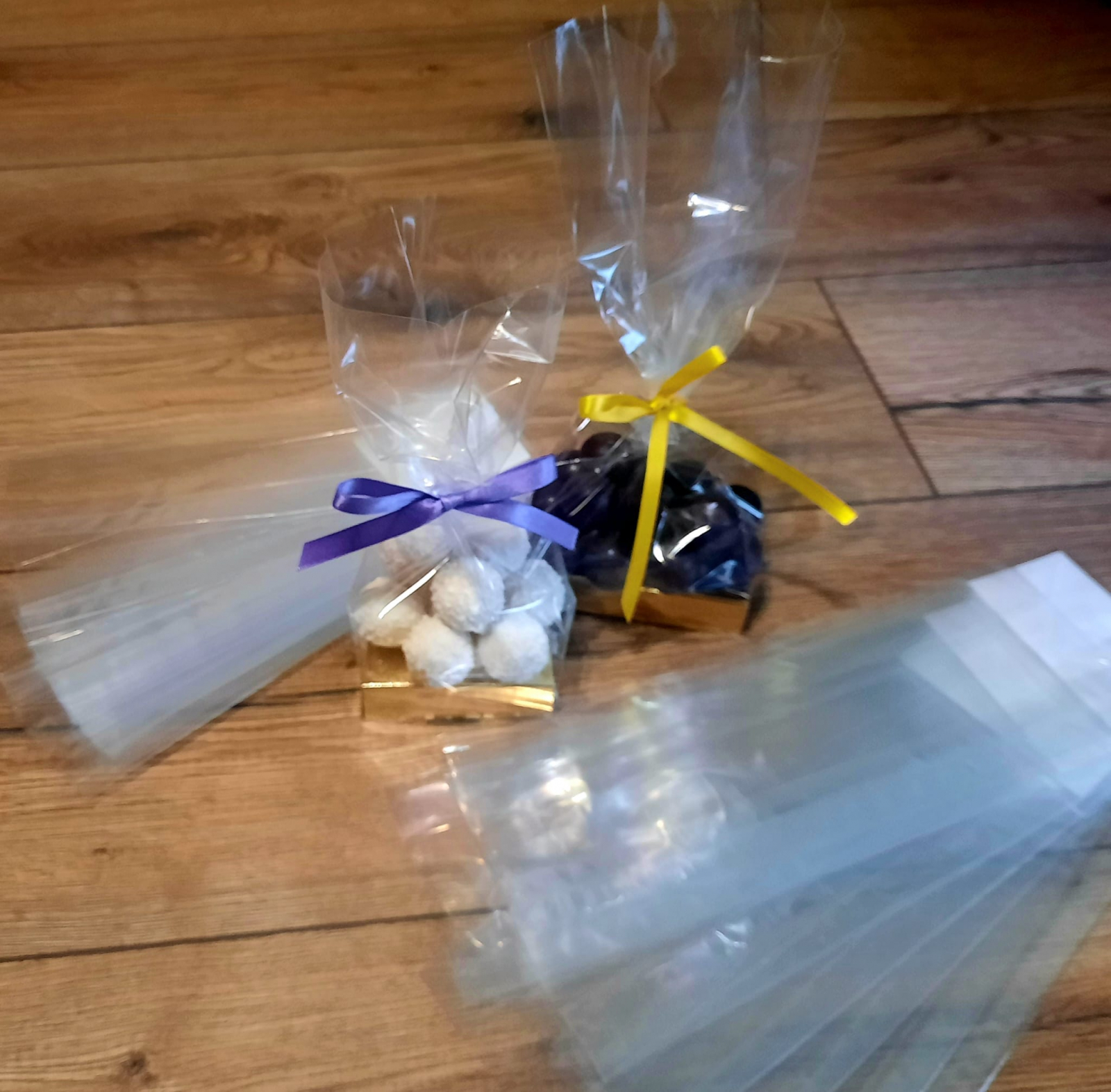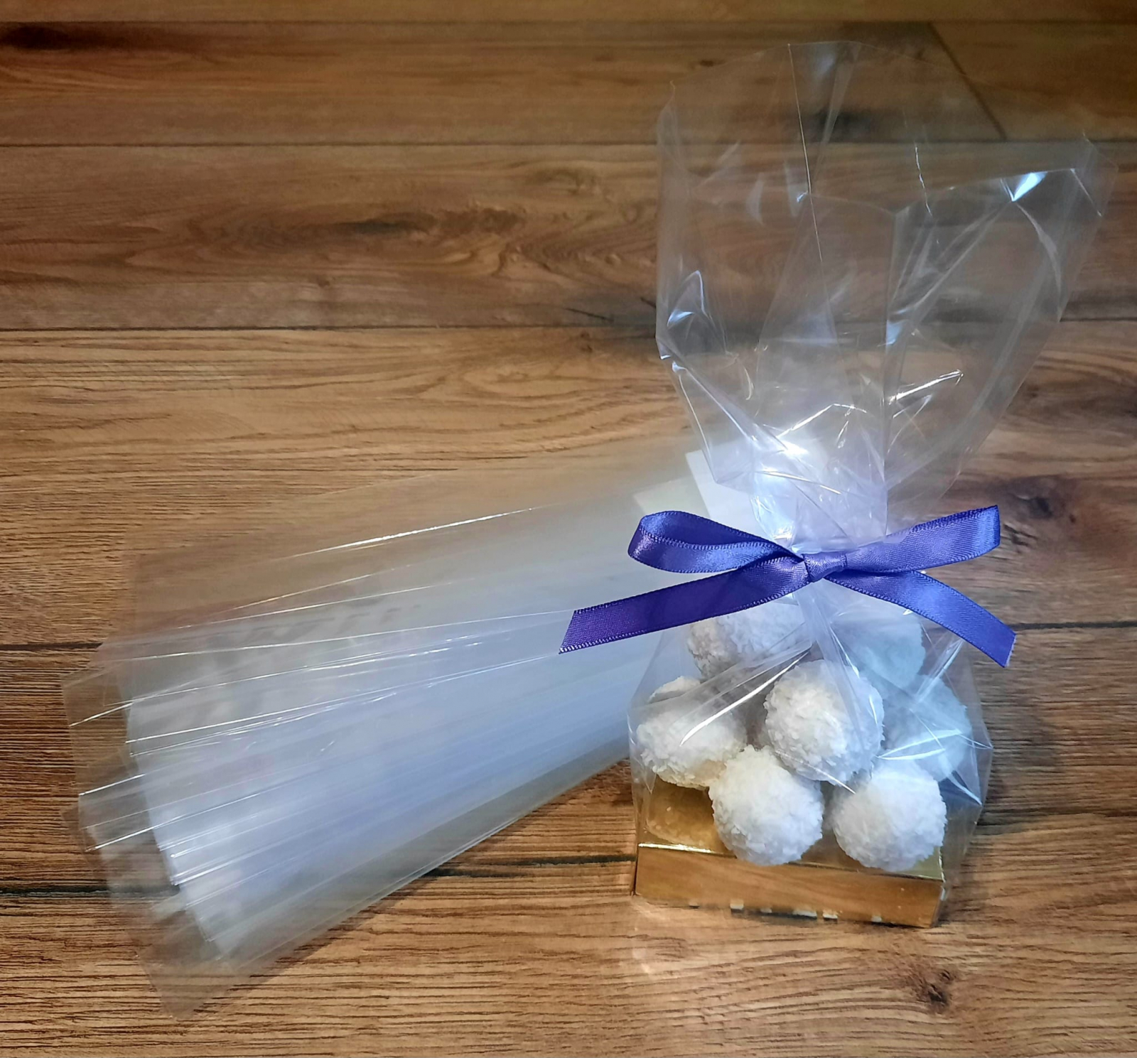 - punga din plastic transparent pt bomboane, ciocolata, drajee, marturii etc + inaltaor carton auriu