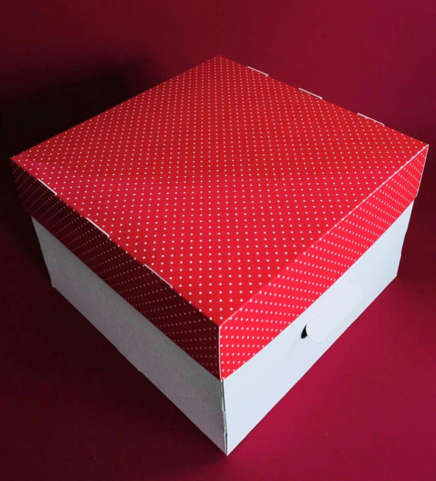Cutie Pentru Tort 30X30X20 CM, fără fereastră, capac ROSU CU PUNCTE plastifiat lucios, Set 5 Buc