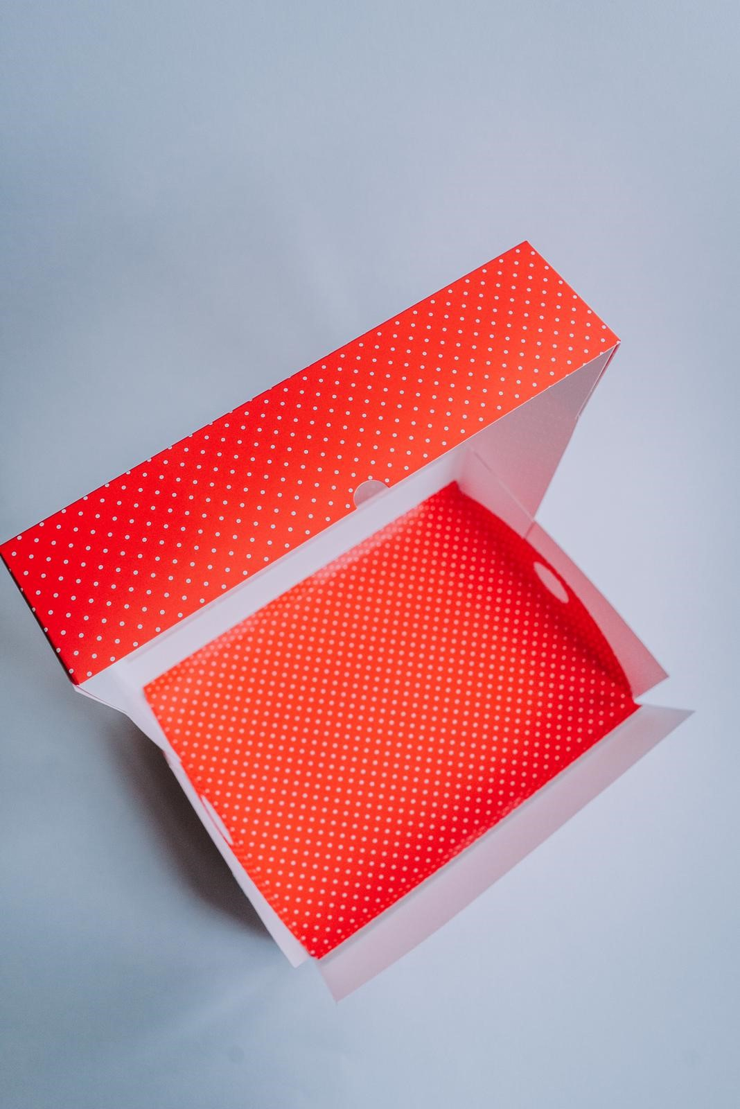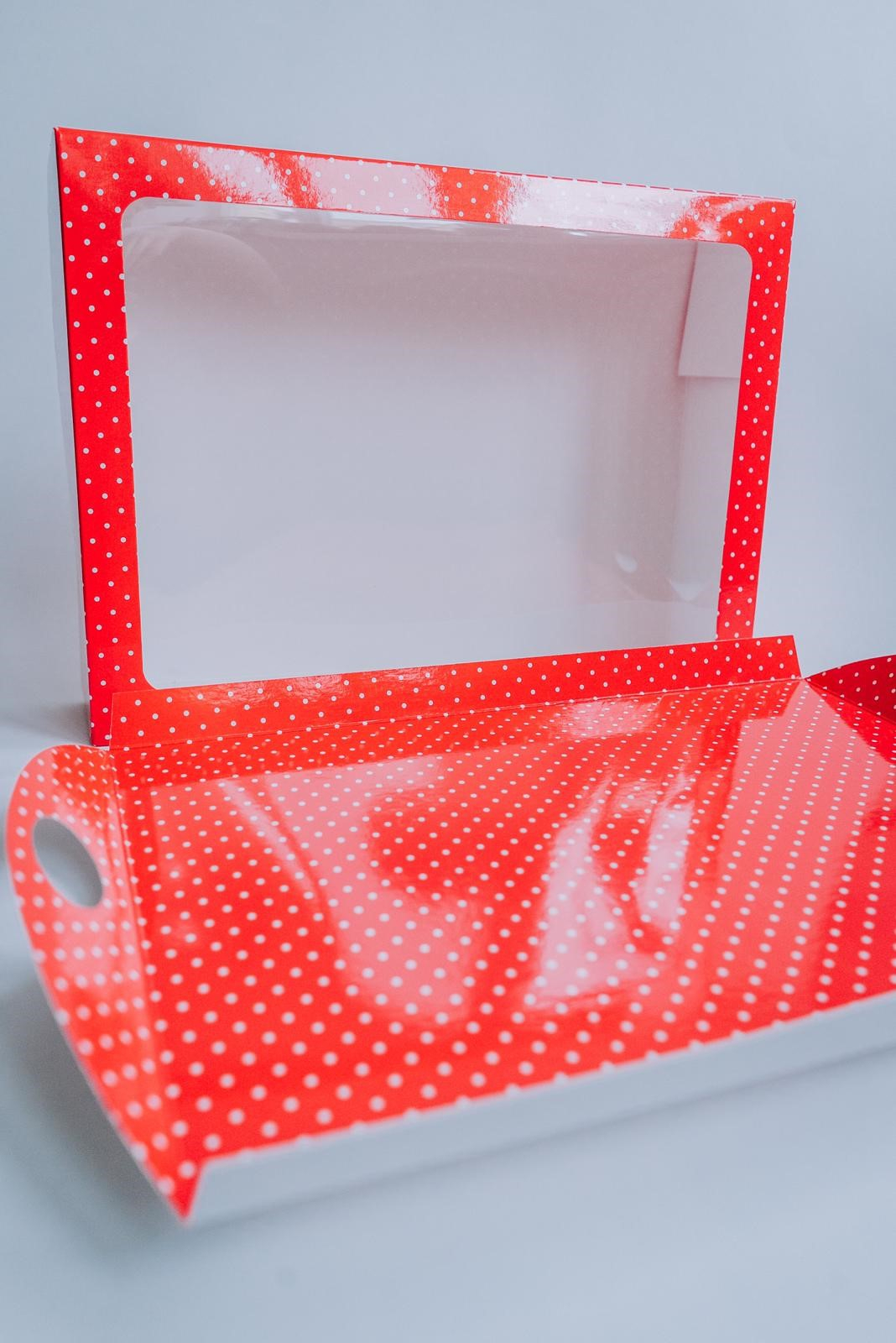 Cutie 30x22x7.5 cm, cu fereastra si tavita, rosu cu puncte plastifiat lucios