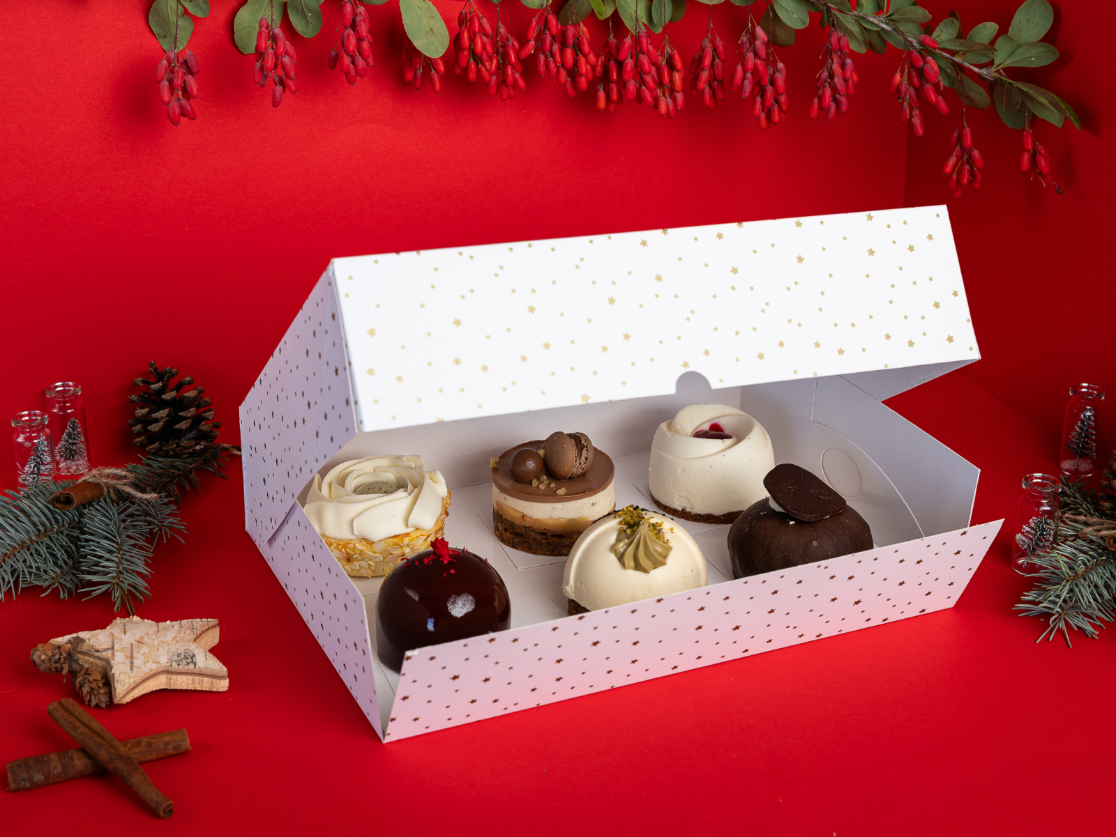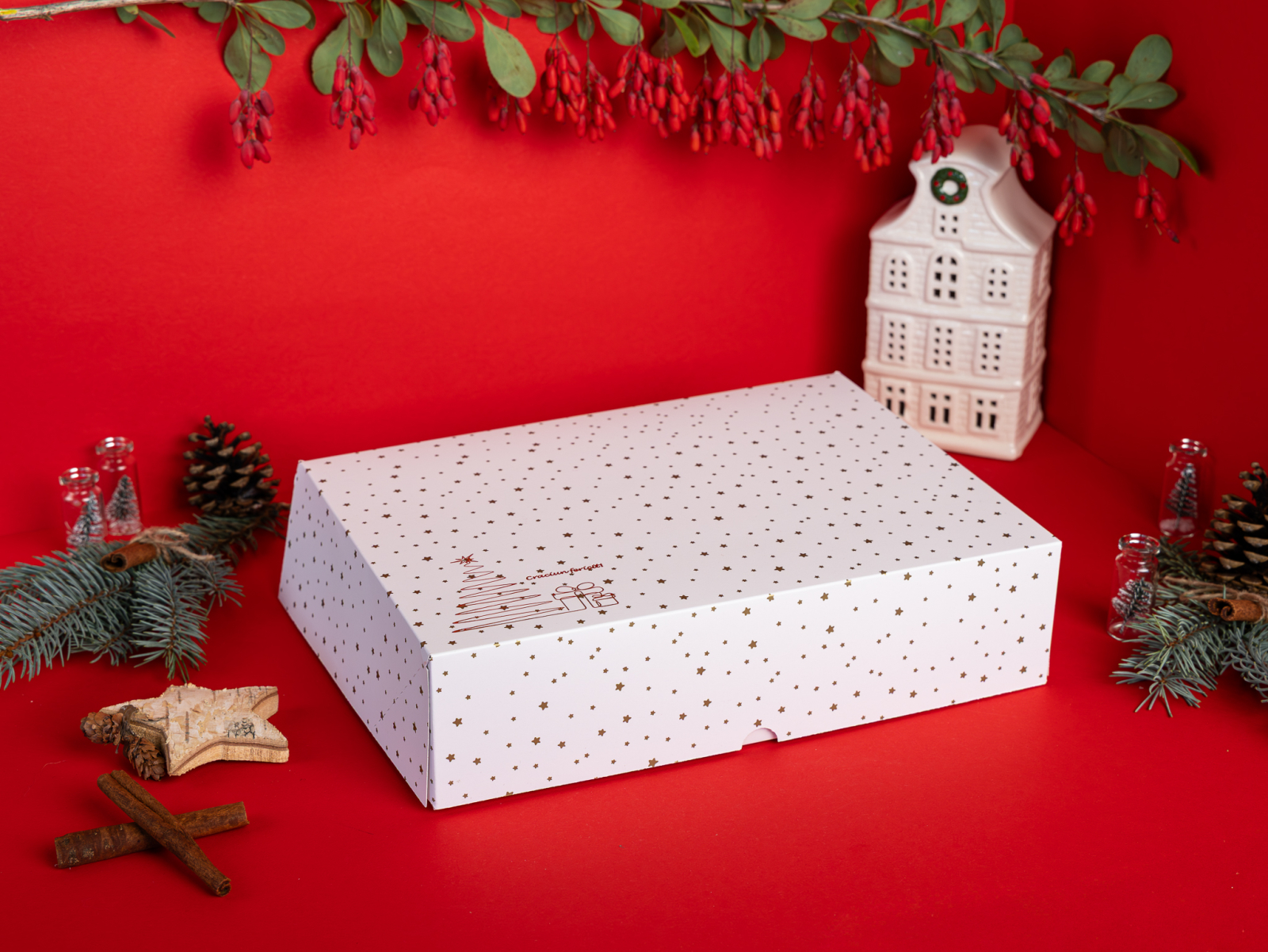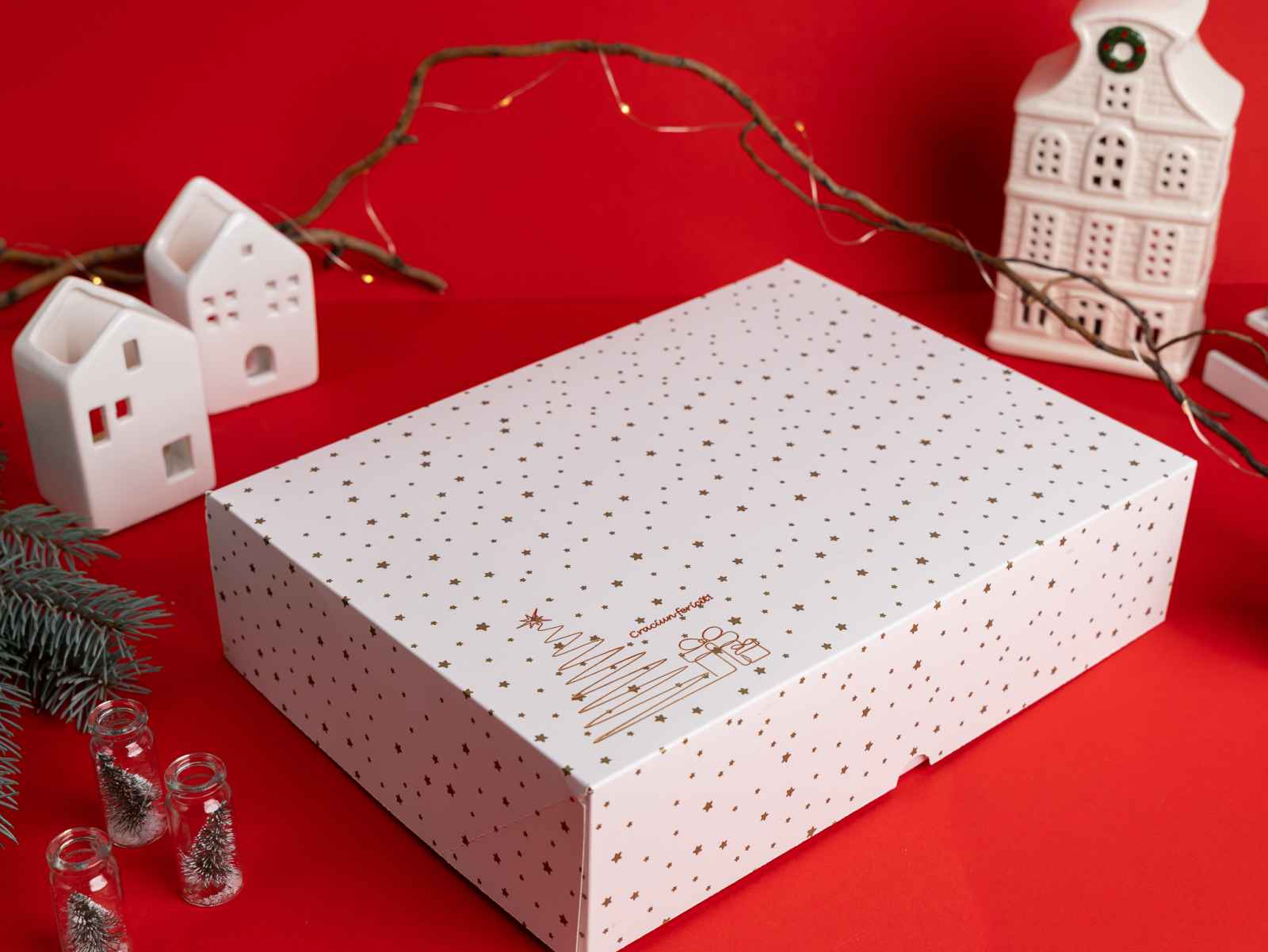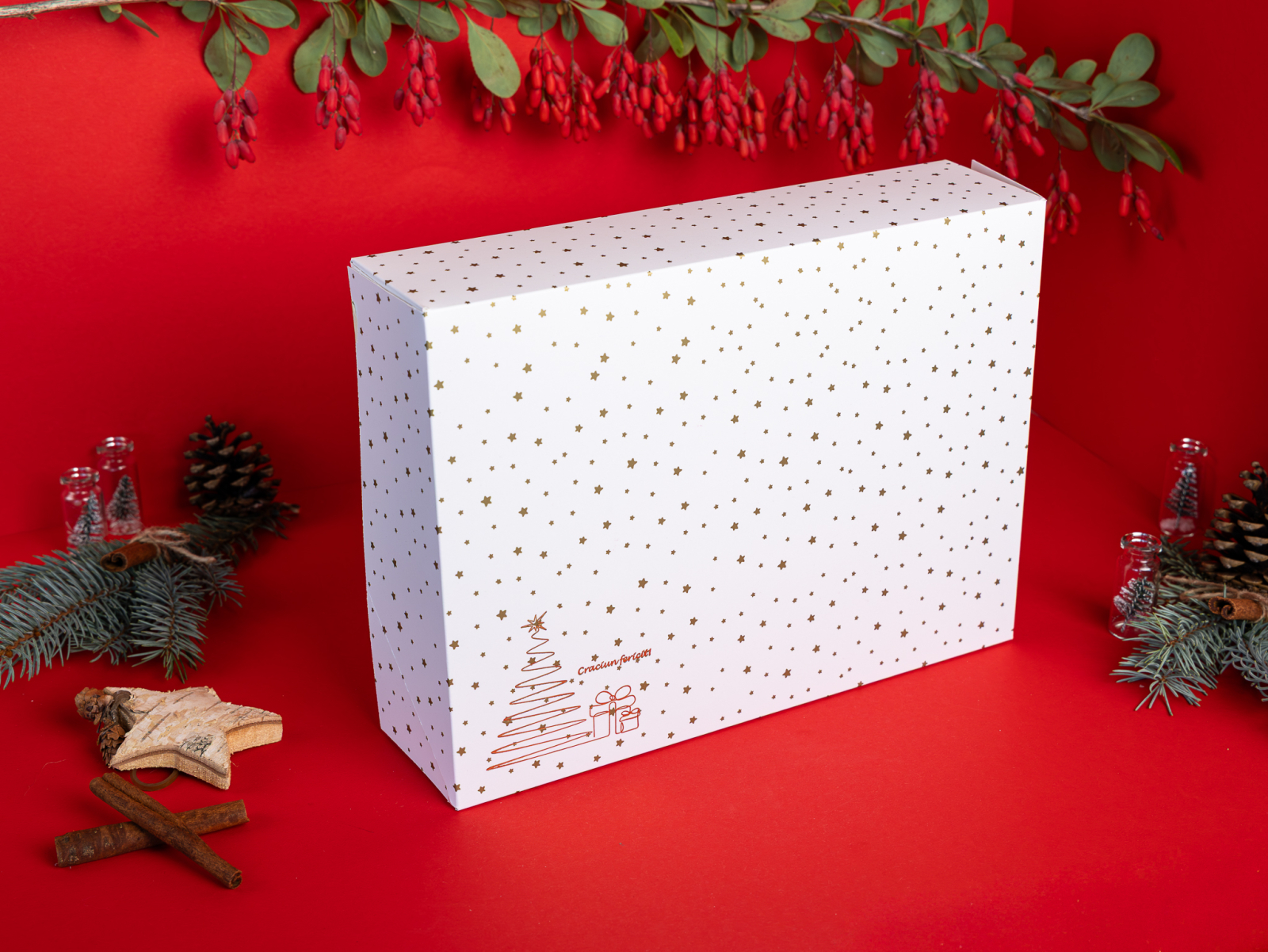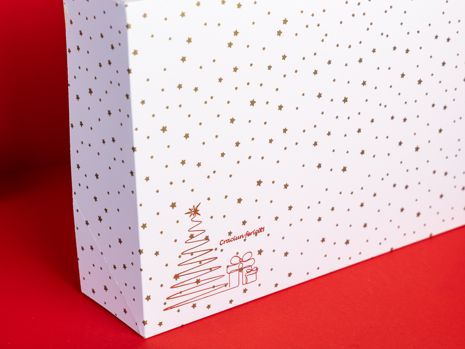 Cutie deschisa 30x22x7.5 cm, tipar stelute plastifiat mat + folio auriu bradut + mesaj de Craciun, tavita inclusa, livrate plate, set 5 buc. Stocuri limitate.