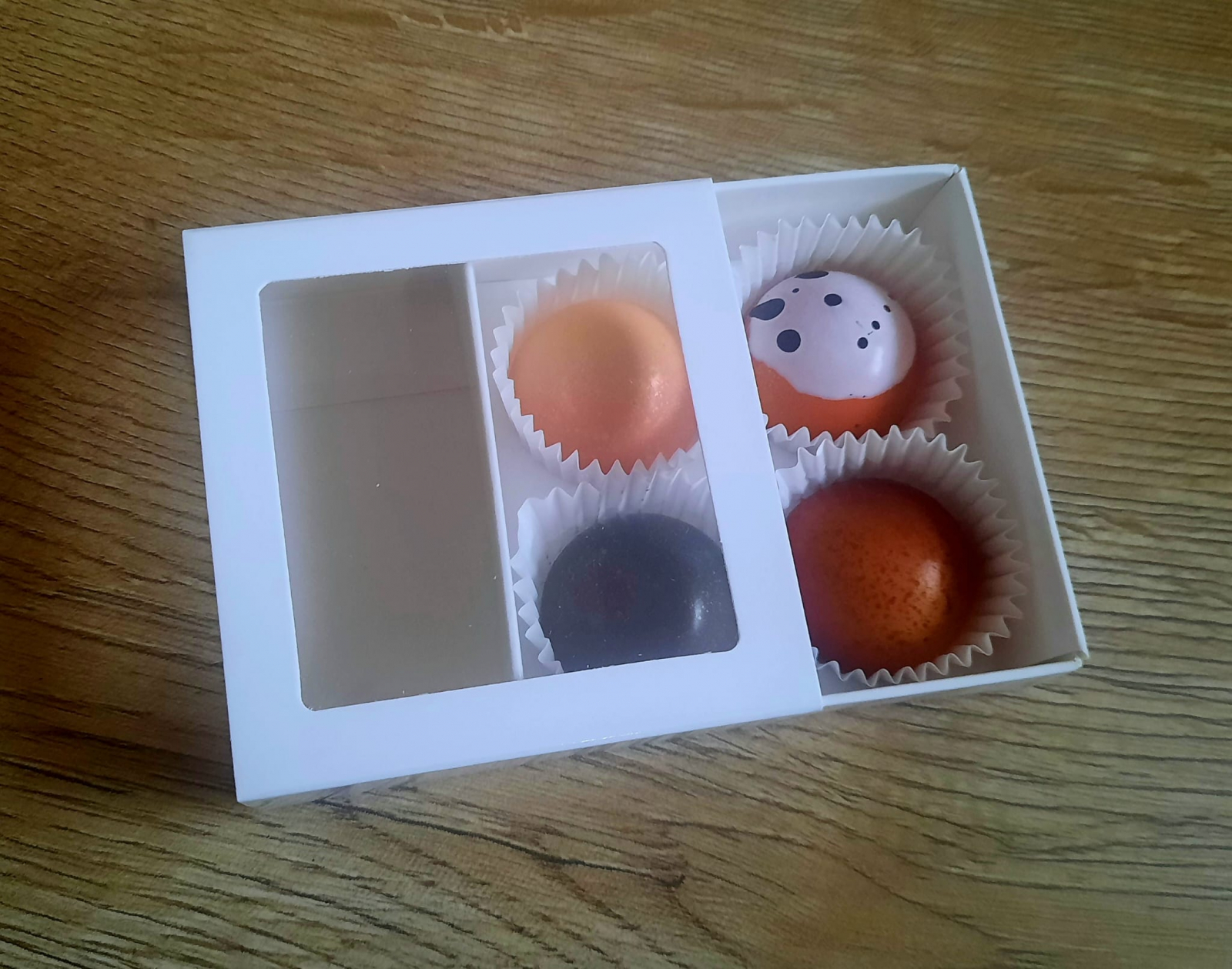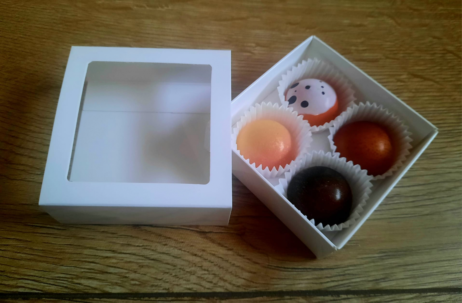Cutie pentru 4 praline, 72x72x25mm, sertar + manson cu fereastra, alb lucios, set 5 buc
