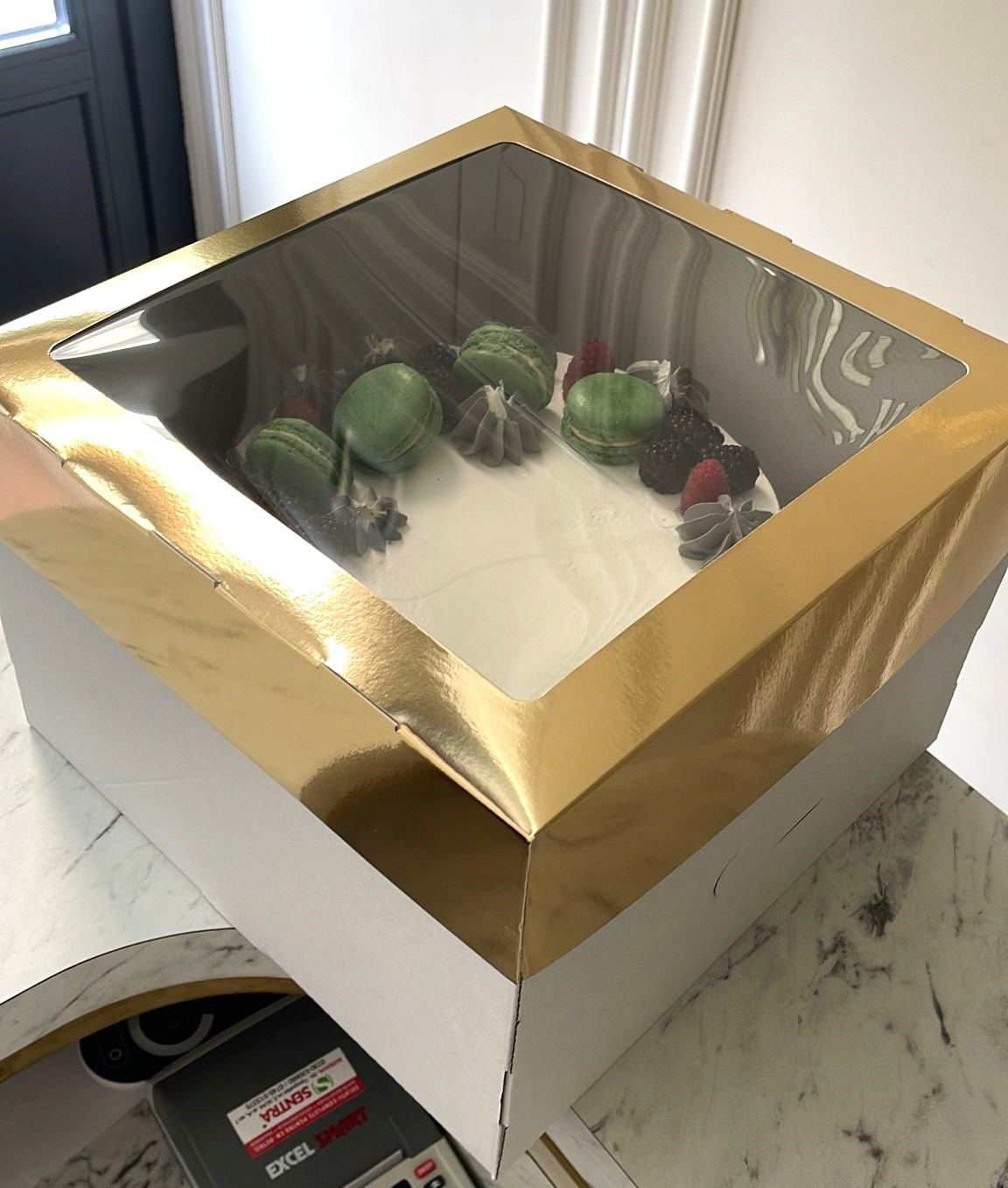 Cutie tort 30x30x15 cm, fund alb + capac auriu cu fereastra, manere predecupate, set 5 buc.