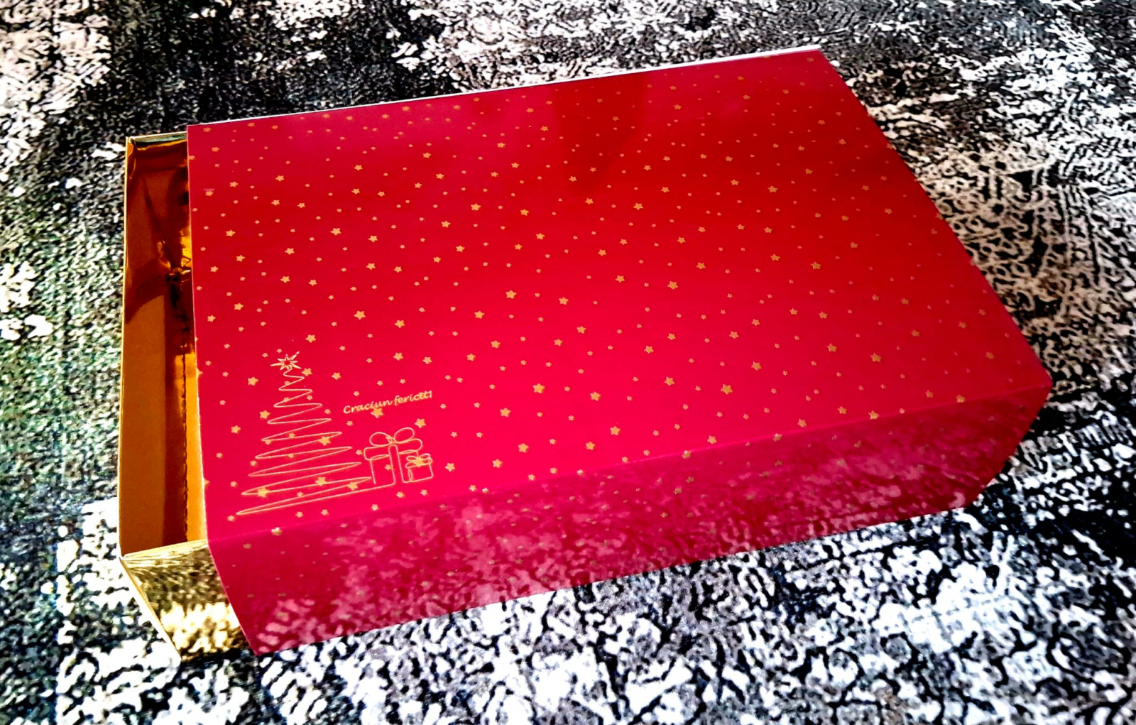 Cutia de Craciun marca Allvelo, 34x23x10 cm, capac stelute aurii pe fond bordeau + mesaj de Craciun + sertar auriu. Livrate plate la set de 5 buc. Stoc limitat.